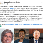 By Diageo Corporate Team The Board of Directors of East African Breweries PLC (EABL) has today announced that Diageo PLC has agreed to sell its majority stake in EABL and its shareholding in the Kenyan spirits business, UDV (Kenya) Limited to Asahi Group Holdings. This acquisition of EABL represents the