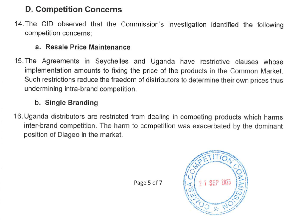 In the case of Diageo, investigation into the matter was commenced on 21st June 2021. The commission based on Article 16 and 21 which both talk about restrictive business practices and the prohibited business practices. In particular, the committee’s determination was based on the clauses in the Production and Distribution agreements that featured, minimum resale price maintenance, single branding restrictions and territorial restrictions.