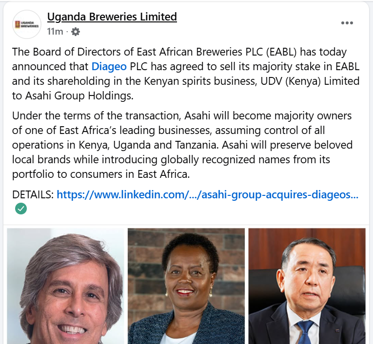 The Board of Directors of East African Breweries PLC (EABL) has today announced that Diageo PLC has agreed to sell its majority stake in EABL and its shareholding in the Kenyan spirits business, UDV (Kenya) Limited to Asahi Group Holdings.